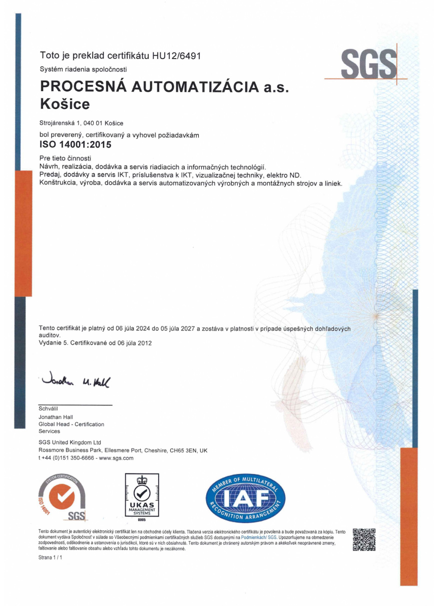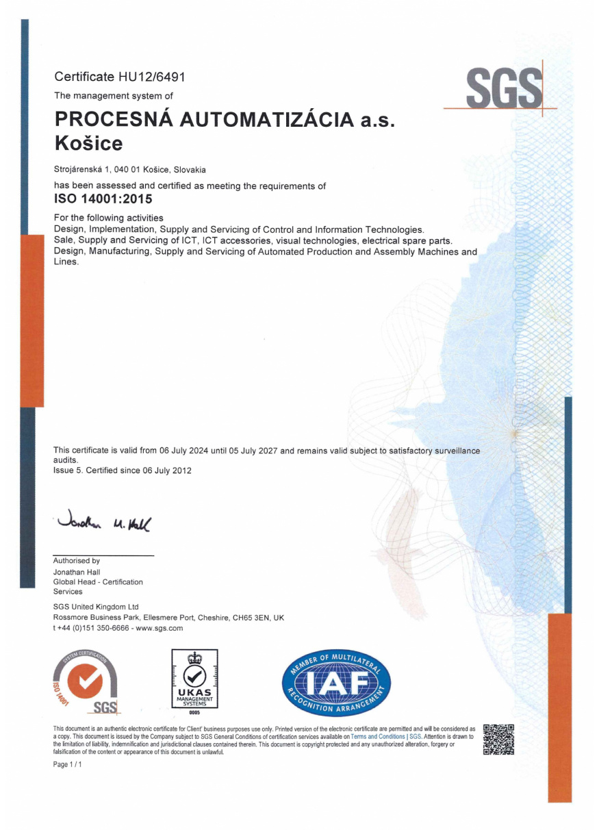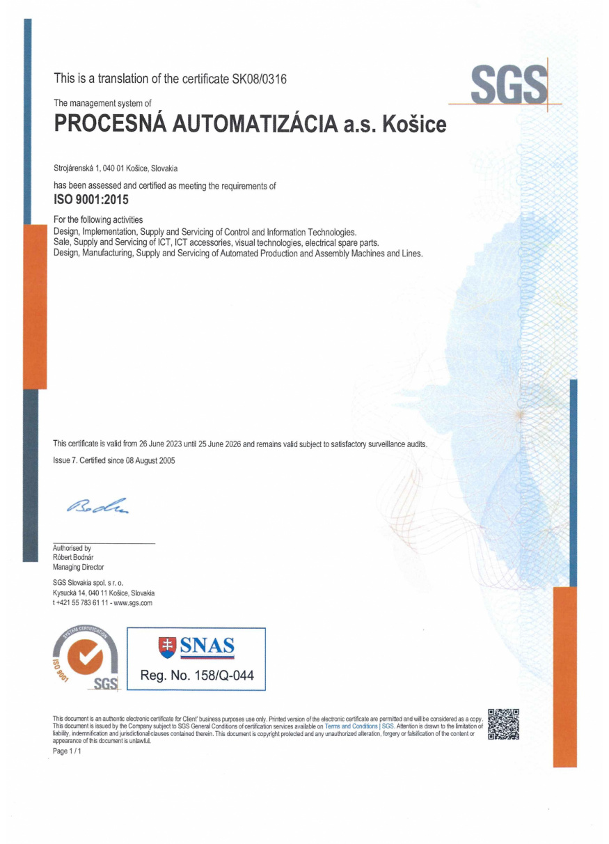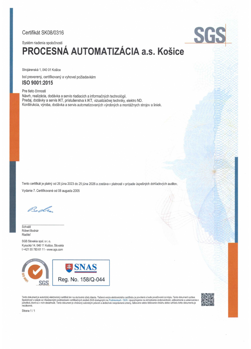 Vo svojej činnosti kladieme stály dôraz na kvalitu dodávaných služieb a riešení. Naša spoločnosť má zavedený integrovaný manažérsky systém, ktorý je pravidelne udržiavaný, vyhodnocovaný a certifikovaný spoločnosťou SGS Slovakia.